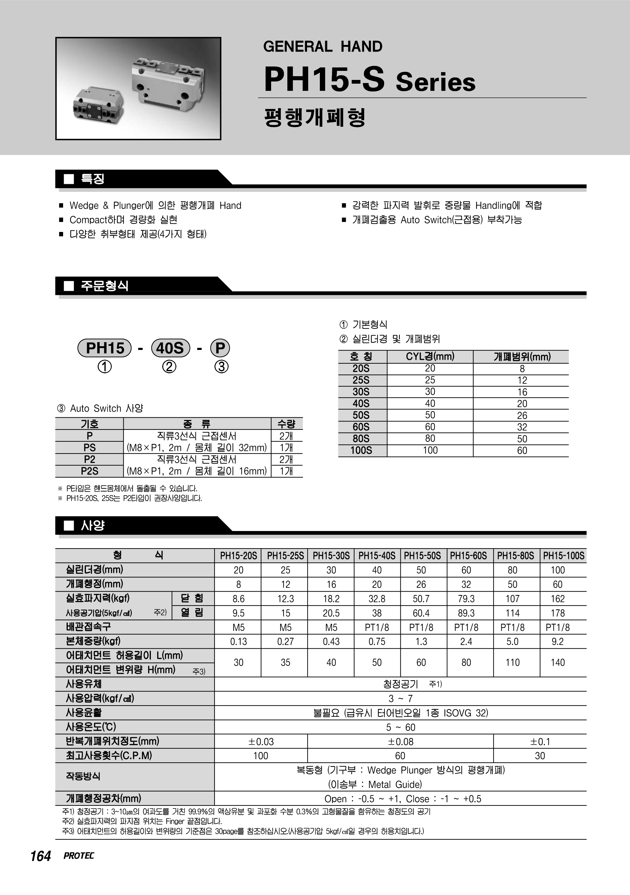 PH15-60S, PH15-80S, PH15-100S, PH15-20S, PH15-30S, PH15-40S, PH15-50S, 프로텍 에어척, PRRTEC, 프로텍. 강력한 파지력 발휘로 중량물 핸들에 적합한 제품입니다. 개폐 검출용 오토 스위치 부착 가능하고. 다양한 취주 형태 제공됩니다. 그리고 콤팩트하며 경량화 실현 제품입니다. Wedge & Plunger에 의한 평행 개폐 핸들 타입입니다.