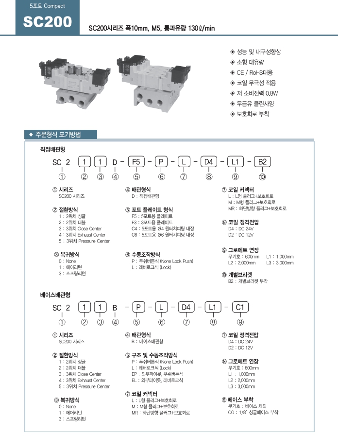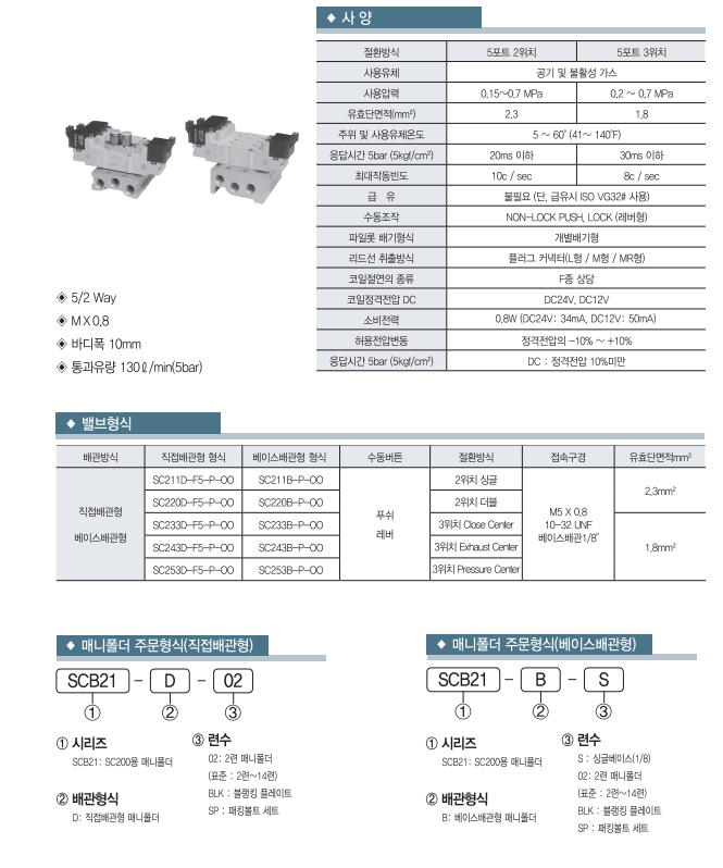 또한 무급유 클린사양, 보호회로 부착, 5/2 Way, MX0.8, 바디 폭 10mm, 통과 유량 130L / min(5 bar) 등이 있습니다.