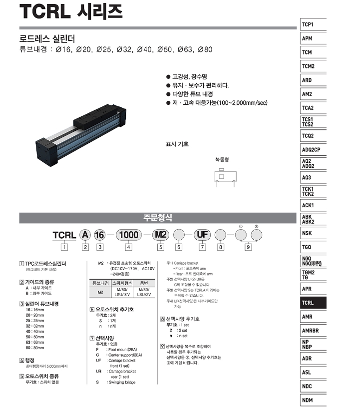TCRLA25-250, TCRLA16-200-F, TCRLA20-400-M2, TCRLA32-1500-M2-C3, TCRLA40-1500-M2-F, TCRLA50-1500-M2, TCRLA63-1200-S2-C, TPC 로드 레스 실린더 알아보기.
