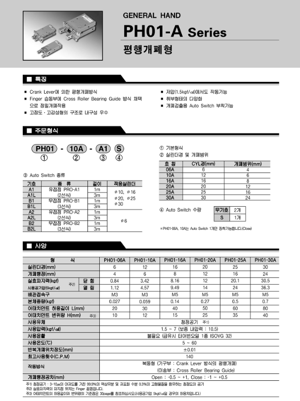 제품 사양이 다양합니다. PH01-06A, PH01-10A, PH01-16A, PH01-20A, PH01-25A, PH01-30A