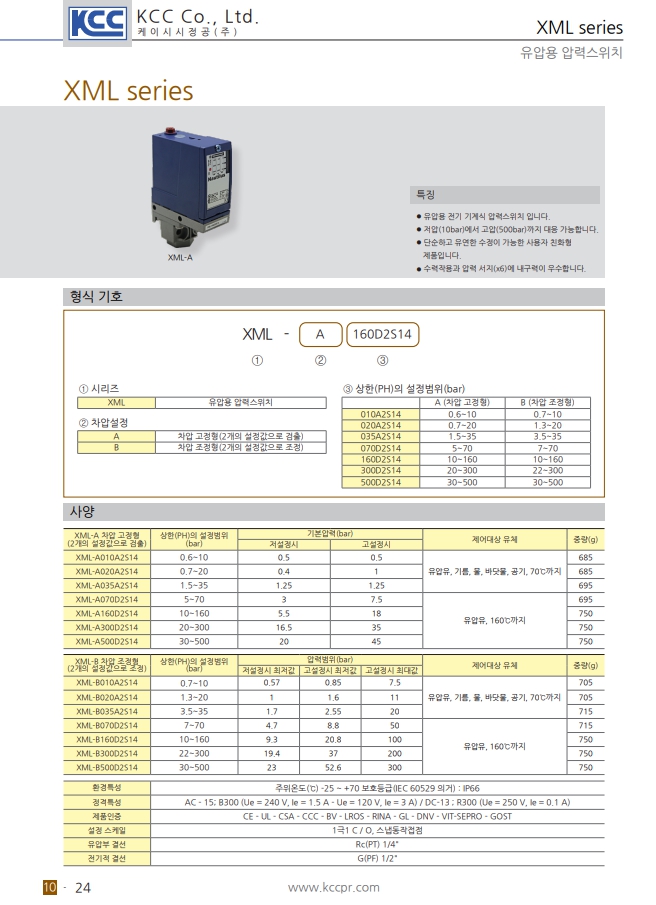 | XML-A010A2S14 | XML-A020A2S14 | XML-A035A2S14 | KCC 유압용 압력스위치 |