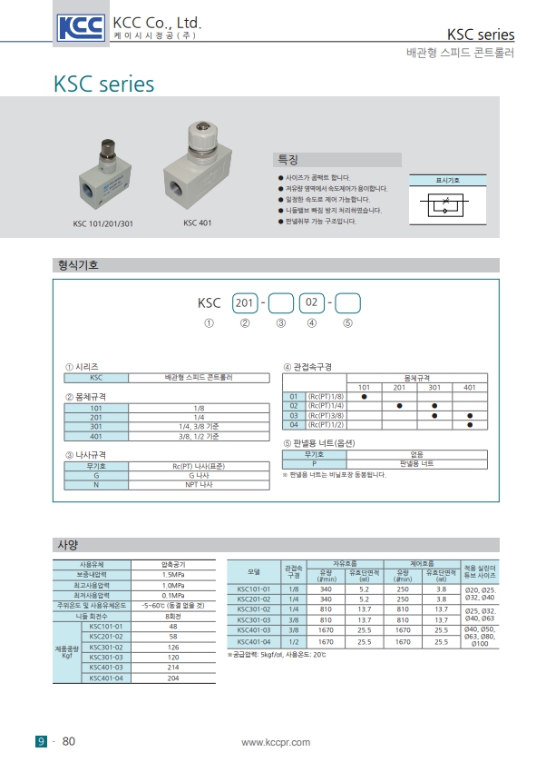 KSC201-02, KSC101-01, KSC301-02, KSC301-03, KSC401-03, KSC401-04, KCC 배관형 스피드 콘트롤러 알아보기.