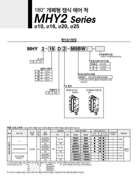 MHY2-20D, MHY2-16D, MHY2-10D, MHY2-25D, SMC 180 º 개폐형 캠식 에어척 알아보기.