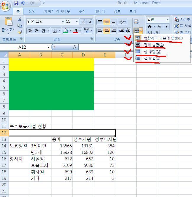 셀 전체 병합도 있고 셀 병합도 있습니다.