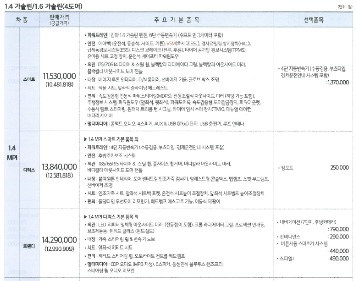 선택 세부사양이 다양하게 있습니다. 컨포트와 컨비니언스 세단 해치백 참고 하시어 선택 하시면 됩니다.