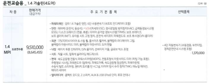1.4가솔린으로 운전 교습용도 나옵니다. 도로 연수용 차는 일반인이 구매 하기가 어렵습니다.