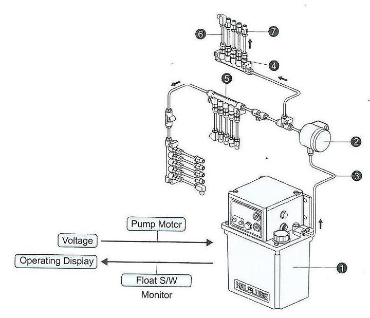 집중 윤활 장치는 윤활 급유 개소에 연결된 배관을 통하여 펌프에서 압송된 윤활제 흐름에