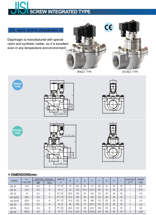 JISI20, JISI25, JISI32, JISI40(S), JISI40(D), JISI50, JISI65, JISI80, 조일 밸브.
